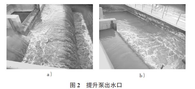 1)降低進(jìn)水跌水曝氣強(qiáng)度,減少進(jìn)水溶解氧對(duì)系統(tǒng)的影響。該污水處理廠分兩期建設(shè),在進(jìn)行一期建設(shè)時(shí),預(yù)處理工段構(gòu)筑物即按12.0×104m3/d的規(guī)模一次建成,在污水提升泵站處設(shè)置一期、二期配水井一座,如圖2所示。配水井設(shè)置有提升泵出水口、消能槽和配水槽,一、二期的配水量通過配水槽出水閥門進(jìn)行調(diào)節(jié)。由圖2a)可看出,經(jīng)過提升泵提升的廢水經(jīng)過兩次跌水,一次是出水口到消能槽的跌水,跌水高度約計(jì)500mm;另一次跌水在配水槽處,跌水高度在900mm左右。