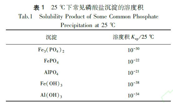 不溶性磷酸鹽沉淀物的溶度積在一定程度上也會(huì)影響除磷劑的除磷效果。根據(jù)溶度積原理,相同類(lèi)型的難溶電解質(zhì)Ksp越小,溶解度越小,從而越容易生成沉淀,磷的去除效果越好;反之,K越大,溶解度越大,去除效果越差。了解不同沉淀物的溶度積,可以為選擇除磷劑提供參考。一些常見(jiàn)沉淀的溶度積如表1所示。