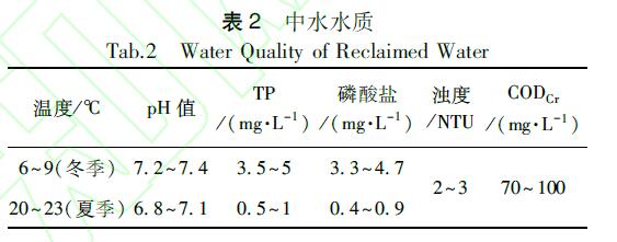 模擬含磷廢水2:采用磷酸二氫鉀和山東建筑大學(xué)中水站出水配制,模擬較差水質(zhì)(即TP含量為5mg/L)。中水站出水觀察顏色為淺黃色,略渾濁,具體水質(zhì)如表2所示。