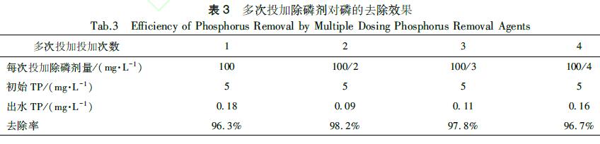 根據(jù)一次投加效果,選擇除磷效果較佳的污水除磷劑進(jìn)行多次投加試驗(yàn)。選擇污水除磷劑投加量為100mg/L,按照多次投加次數(shù)對(duì)除磷劑投加總量進(jìn)行等量均分后進(jìn)行投加,結(jié)果如表3所示。