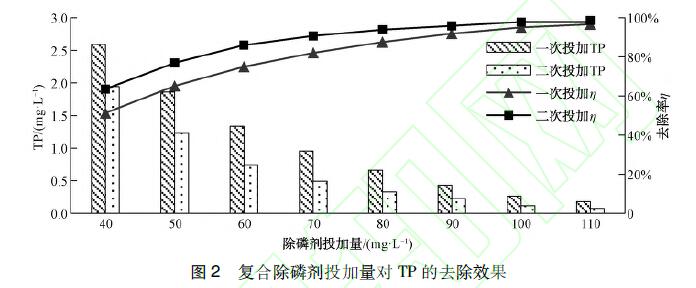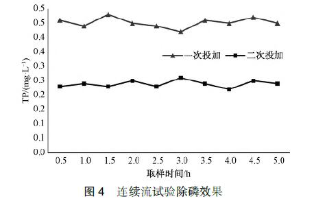 取500mL初始TP濃度為5 mg/L的實(shí)際水樣置于攪拌機(jī)上,分別按照一次、二次投加方式投加污水除磷劑,混凝后靜沉30min,取上清液進(jìn),行指標(biāo)測(cè)定。由圖2可知,二次投加除磷效果好,當(dāng)污水除磷劑投加量為90mg/L時(shí),出水TP可達(dá)到0.22mg/L,此時(shí)去除率為95.9%,比一次投加時(shí)磷去除率增加了3.95%,出水TP濃度減少了近二分之一,這與配水試驗(yàn)結(jié)果相似。因此,在連續(xù)流試驗(yàn)中選取污水除磷劑二次投加的方式除磷。