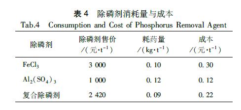 按照處理TP為5mg/L的生活廢水達(dá)到地表水IV類(lèi)標(biāo)準(zhǔn)計(jì),需消耗除磷劑量與成本估算如表4所示。