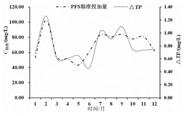 圖3 TP二沉池出口與PFS精準(zhǔn)投加量相關(guān)性
