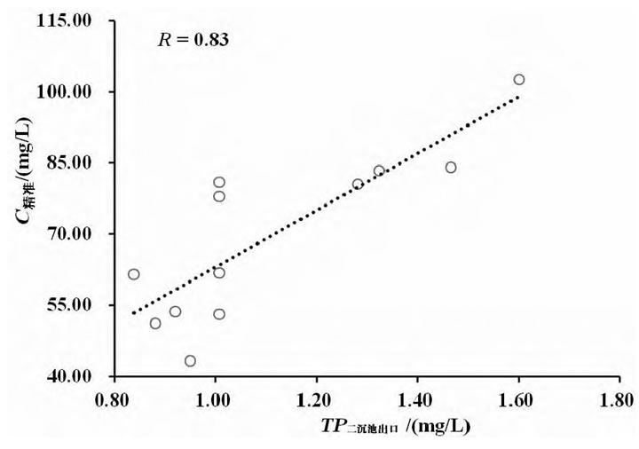 (2)通過TP二沉池出口推測(cè)C精準(zhǔn),其兩者線性回歸方程為C精準(zhǔn)=59.833TP二沉池出口+3.2527(γ=0.83),并通過檢驗(yàn)兩者線性顯著相關(guān)(P<0.01)。