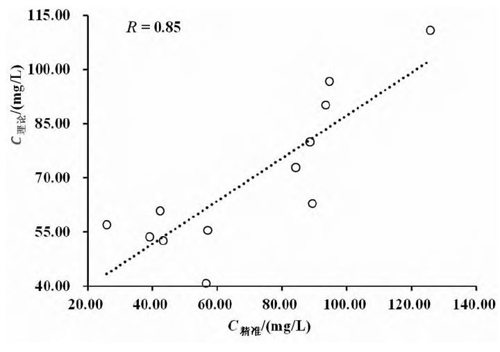 擬合線性回歸方程得C精準(zhǔn)=0.5929C理論-27.98(γ=0.85),回歸曲線如圖2所示。經(jīng)計(jì)算γ=0.85,取α=1%,查數(shù)理統(tǒng)計(jì)表可知γ(12)=0.697。因γ>γ(12),由此線性回歸顯著,兩者線性相關(guān)較好。
